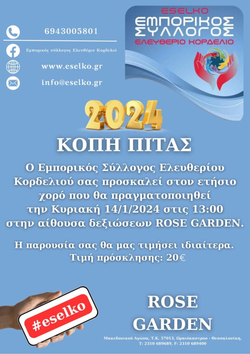 Ο Εμπορικός Σύλλογος Ελευθερίου Κορδελιού διοργανώνει στις 14/01/2024 ώρα 13:00 τον ετήσιο χορό και την κοπή της πίτας στην αίθουσα δεξιώσεων Rose Garden! Η παρουσία σας θα μας τιμήσει ιδιαίτερα. Σας περιμένουμε εκεί!